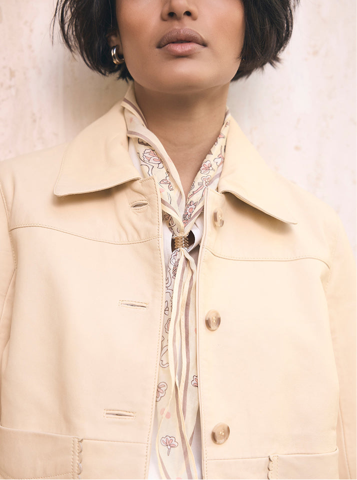 Cut from sumptuous leather, this yellow jacket features scallop detailing for a feminine modern finish