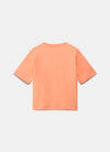 • Orange t-shirt with a crew neckline and short sleeves.