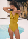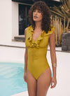 - Green tone tummy control swimsuit with a V-neckline, ruffle trim, gathered detail, adjustable straps and a clasp fastening through the back.